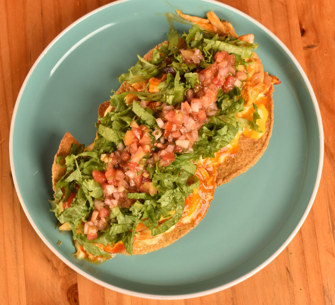 Tortilliita de maíz, frijoles molidos, queso mozzarella, queso cheddar, carne mechada de pollo y res, natilla, lechuga, pico gallo, salsa de queso, mayonesa de la casa y ketchup. Acompañada de papas a la francesa